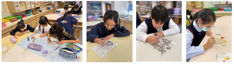 學生利用金色和黑色的綑邊液,在仿玻璃膠片上畫上圖案,創作出獨一無二又有節日色彩和氣氛的聖誕玻璃彩繪。